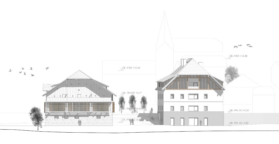 Das Wirtsgebäude soll in ein Haus für Betreutes Wohnen umgewandelt werden. Der Großteil an Nebenräumen ist im Kellergeschoss situiert. Diese bieten auch eine Verbindung zum Außenraum. Hier befinden sich etwa Sitzmöglichkeiten und Hochbeete, die sowohl von den Mitarbeiter_innen als auch von den Bewohner_innen genutzt werden können.