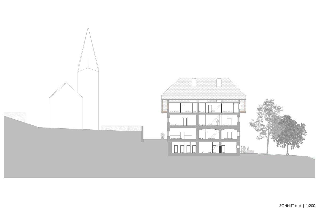 Stellvertretend für den Privaten Bereich steht das Wirtsgebäude, in welchem Wohnungen für alle Altersgruppen untergebracht werden. Im Kellergeschoss befinden sich den Wohnungen zugewiesene Lagerräume, eine Werkstatt und ein Fahrrad- und Kinderwagenabstellraum. Durch die zwei Denkmalgeschützten Stuben im Erdgeschoss, welche zu Gemeinschaftsräumen umfunktioniert wurden, besteht die Möglichkeit eines familiären Miteinanders. Zudem entstehen soziale Kontakte zwischen Bewohnern unterschiedlichster Altersgruppen. Unterschiedlich große Wohnungen sind im Erdgeschoss sowie in den Obergeschossen situiert. Aufgrund der abweichenden Wohnungsgrößen kann auf die Lebenslage der einzelnen Nutzer eingegangen werden. So können sowohl Alleinstehende als auch Paare und Familien entsprechende Wohnungen erwerben.